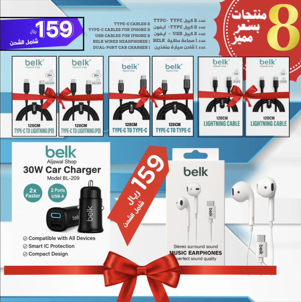 بكج من 8 منتجات Belk - عدد 6 كيبلات, سماعة, شاحن سيارة, الشامل24, 2092