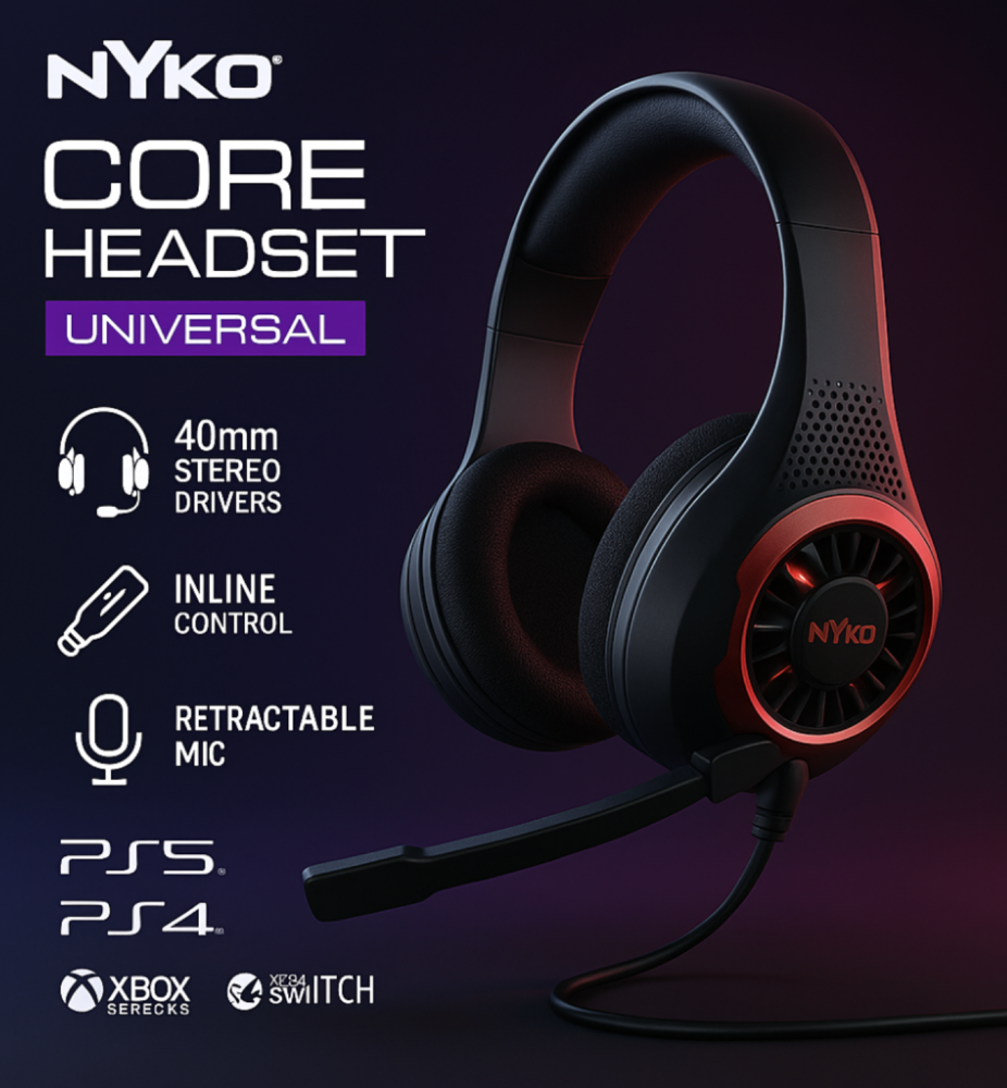 سماعة NYKO Core Headset توفر صوت ستيريو قوي بفضل درايفر 40mm، مع ميكروفون قابل للسحب وتحكم مدمج. متوافقة مع مختلف المنصات لتجربة ألعاب ومكالمات أوضح وأكثر راحة.