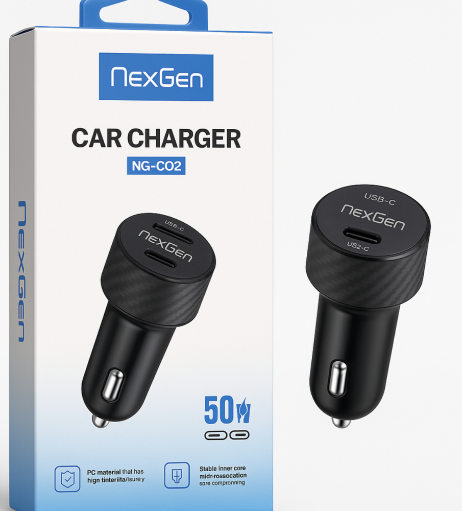 شاحن سيارة NexGen سريع وأنيق، بمنفذين USB-C، يدعم PD وQC بقدرة تصل إلى 50 واط، مصنوع من مواد مقاومة للحرارة وآمن للاستخدام أثناء التنقل.
