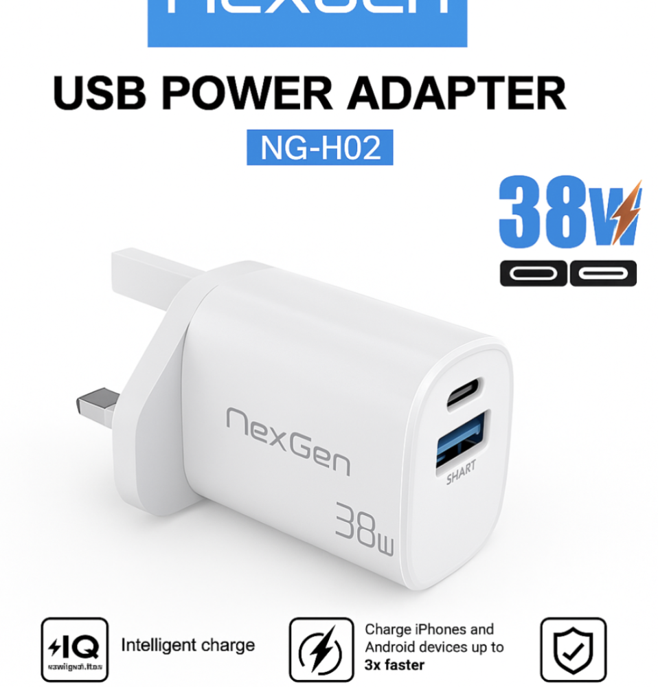 شاحن NexGen، شاحن سريع، شاحن USB-C، شاحن USB-A، شاحن 38 واط، شاحن قوي، شاحن مكتبي، شاحن منزلي، شاحن آمن، شاحن حماية ذكية، شاحن متعدد المنافذ، شاحن للهواتف، شاحن للأجهزة اللوحية، شاحن سريع آمن، NexGen NG-H02، شاحن جدار، شاحن قوي متين، شاحن ذكي، شاحن سريع للآيفون، شاحن سريع للأندرويد