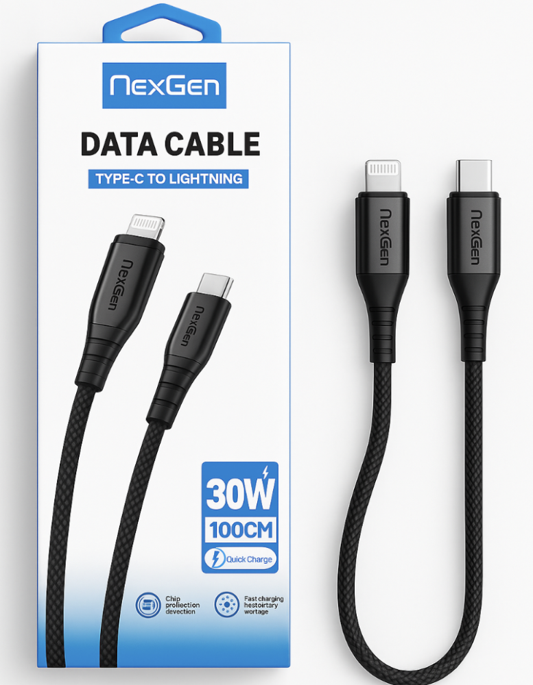 كيبل NexGen Lightning PD يوفر شحنًا سريعًا 30W ونقل بيانات ثابت، بتصميم متين ونايلون مجدول لضمان الاستخدام اليومي.